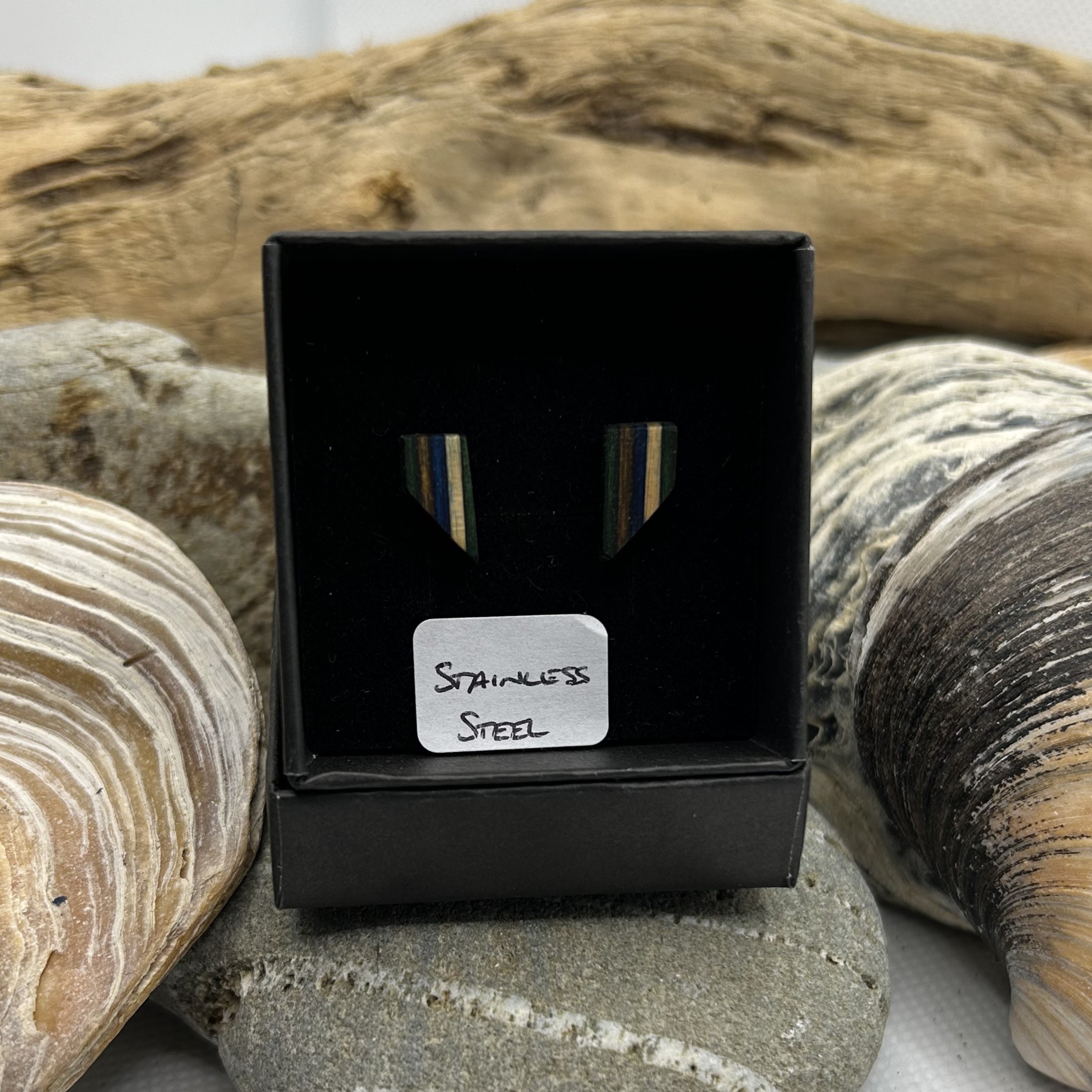 These Striped Ply Wood Earrings measure approx 11mm(at the longest point) x 6mm and are on stainless steel backs.