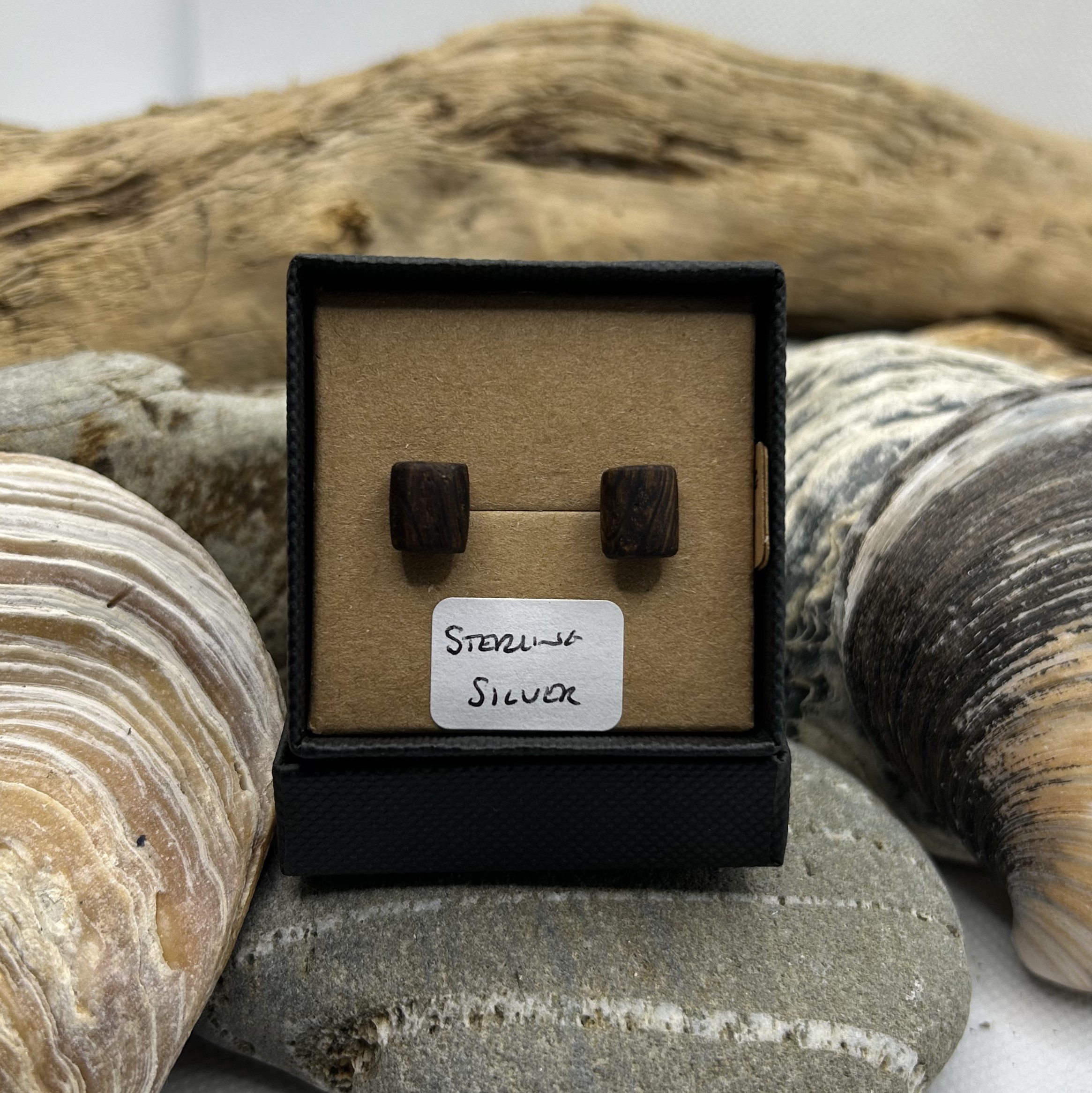 These Oak Wood Earrings measure approx 8mm x 7mm and are on sterling silver backs.
